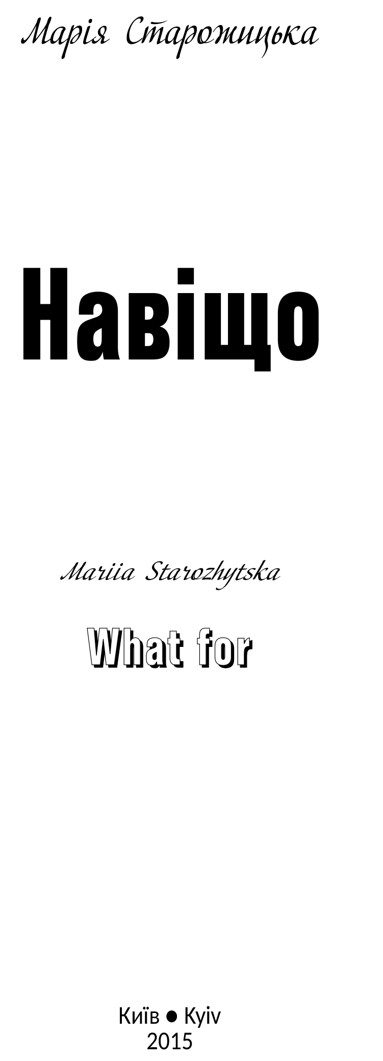 Вы здесьНавіщо. What For (fb2) Марія Старожицька Навіщо. What For [uk] 1488K, 93 с. издано в 2015 г. Добавлена: 13.07.2019 Аннотация